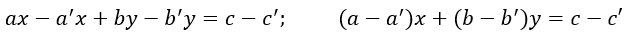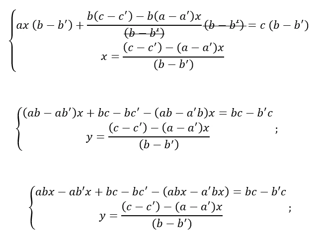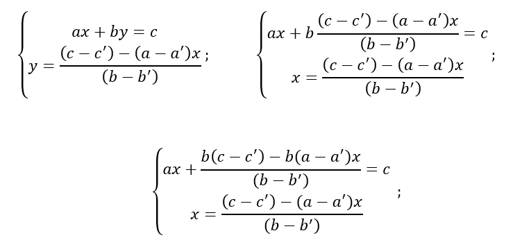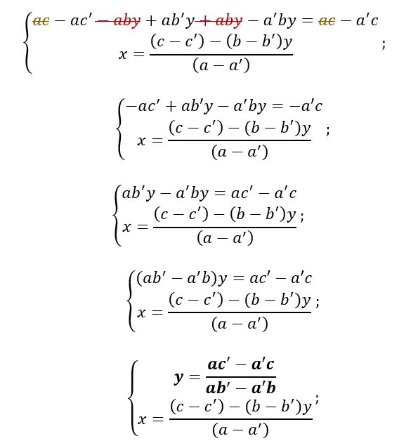 • la differenza del prodotto del coefficiente del secondo membro della seconda equazione con il termine noto della prima equazione e il prodotto del coefficiente del secondo membro della prima equazione con il termine noto della seconda e