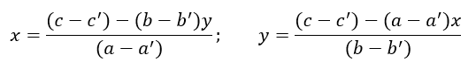Abbiamo radunato i fattori comuni della x e quelli della y applicando la proprietà distributiva della moltiplicazione rispetto alla sottrazione. Da qui ricaviamo le incognite utili a risolvere il sistema: